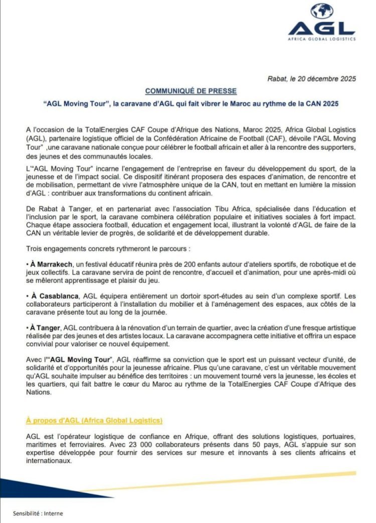 Africa Global Logistics (AGL), partenaire logistique officiel de la Coupe d'Afrique des Nations (CAN) 2025, a lancé l'« AGL Moving Tour », une caravane nationale qui sillonne le Maroc pour promouvoir les valeurs du sport et de la solidarité. Cette initiative vise à laisser une empreinte durable sur le territoire marocain, en particulier auprès de la jeunesse.
