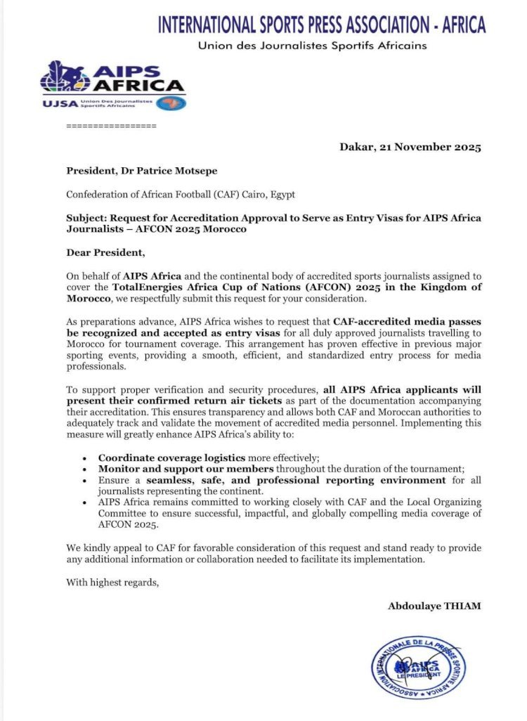 L’Association Internationale de la Presse Sportive Afrique (AIPS-Afrique) dans une lettre adressée le 21 novembre 2025 au président de la Confédération Africaine de Football (CAF), Dr Patrice Motsepe, l’AIPS-Afrique demandé l’instauration d’un dispositif de visas gratuits délivrés à l’arrivée pour tous les journalistes accrédités à la Coupe d’Afrique des Nations Maroc 2025.