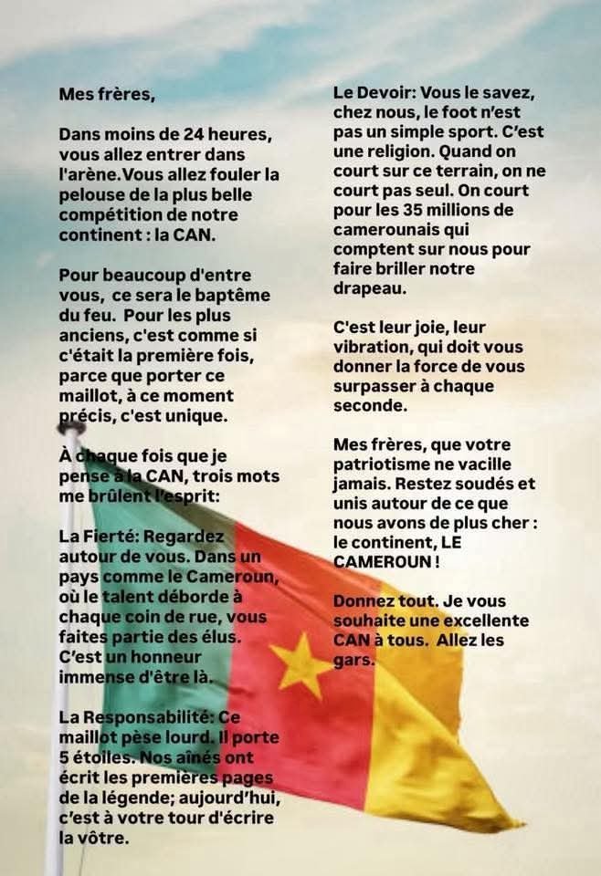 Un message mobilisateur, à la hauteur des attentes, qui vient renforcer l’union sacrée autour des Lions Indomptables à l’aube d’un nouveau chapitre de leur histoire continentale.