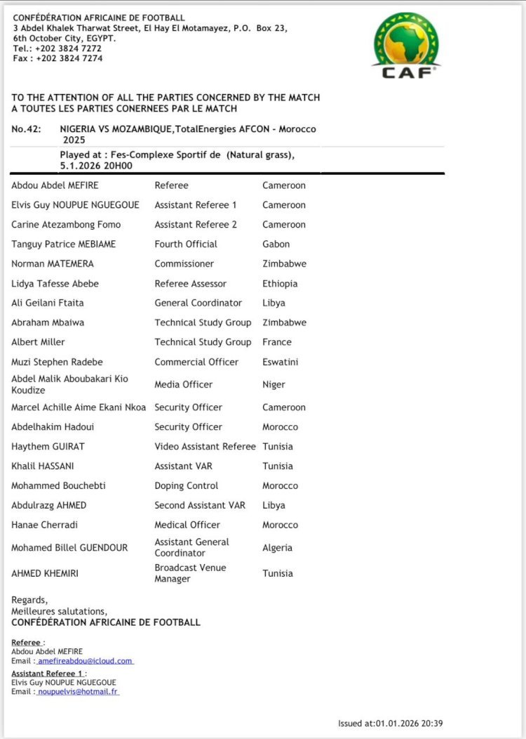 La Confédération Africaine de Football (CAF) a dévoilé la liste des officiels désignés pour la rencontre qui opposera le Nigeria au Mozambique prevue le 5 janvier 2026, au stade de Fès, comptant pour les huitièmes de finale. Le Cameroun y est représenté par quatre officiels, confirmant son poids dans l’arbitrage continental.