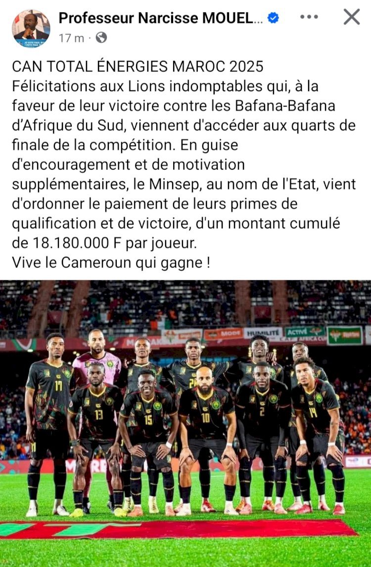 Après la qualification du Cameroun pour les quarts de finale de la CAN TotalEnergies 2025, le ministre des Sports et de l’Éducation physique, le Pr Narcisse Mouelle Kombi, a officiellement félicité les Lions Indomptables tout en annonçant le paiement d’une prime exceptionnelle de 18 180 000 FCFA par joueur.