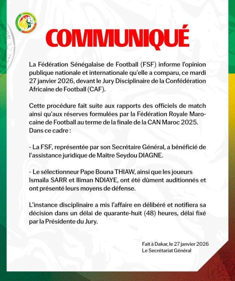 Dans un communiqué rendu public ce mardi 27 janvier 2026, la Fédération Sénégalaise de Football (FSF) a informé l’opinion nationale et internationale de sa comparution devant le Jury disciplinaire de la Confédération Africaine de Football (CAF).