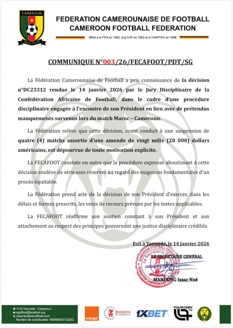 Dans un communiqué officiel publié le 14 janvier 2026, la Fédération Camerounaise de Football a indiqué avoir pris connaissance de la décision n°DC23312 rendue par le Jury disciplinaire de la CAF, dans le cadre d’une procédure liée aux incidents survenus lors de la rencontre Maroc face au Cameroun.