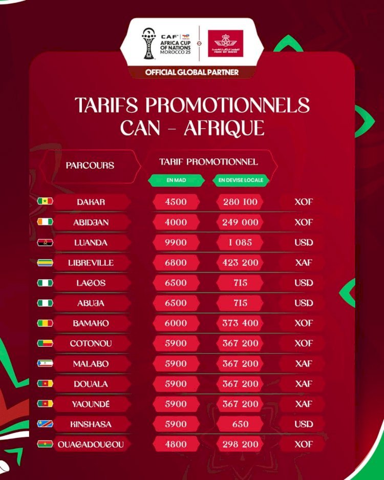 Les billets concernés permettent de voyager du 15 au 31 décembre 2025, avec un premier retour possible dès le 1er janvier 2026. Grâce à cette initiative, les supporters de plusieurs pays du continent pourront rejoindre le Maroc à des tarifs nettement réduits, une aubaine alors que la demande s’annonce particulièrement forte autour de la compétition.