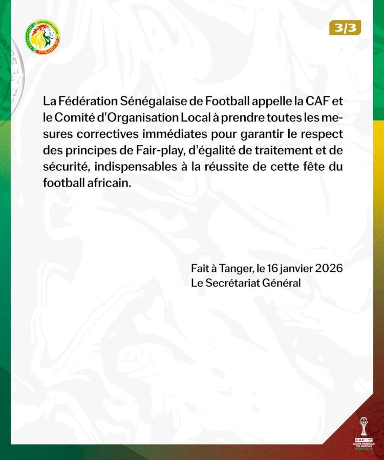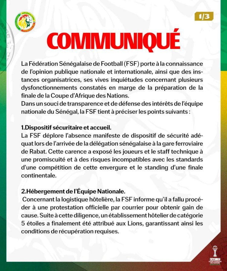 La Fédération Sénégalaise de Football sort de sa réserve et accuse. Dans un communiqué au ton ferme, la FSF fustige une série de manquements graves qui, selon elle, menacent l’équité sportive, la sécurité des Lions et l’image même de l'organisation de cette compétition .