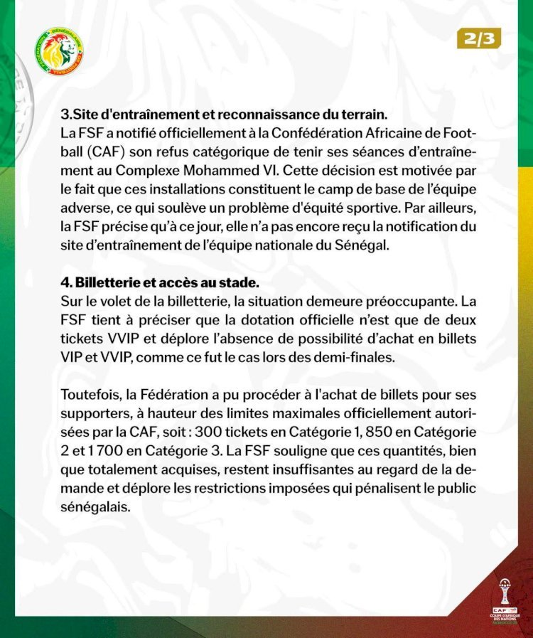 Sur le plan sportif, l’instance sénégalaise parle d’atteinte claire au principe d’équité. Refusant catégoriquement de s’entraîner au Complexe Mohammed VI, camp de base de l’équipe adverse, la FSF dénonce une situation déséquilibrée et affirme ne pas avoir encore reçu, à ce stade, de site d’entraînement alternatif officiellement validé.