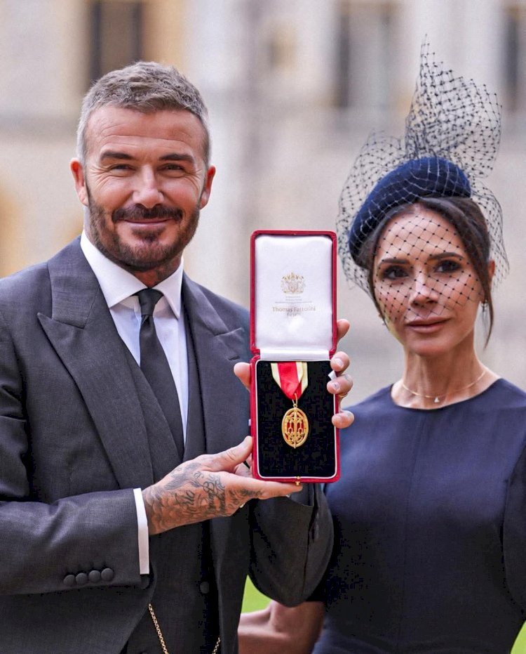 La cérémonie d'anoblissement s'est déroulée en présence de proches, dont sa femme Victoria Beckham, qui a confectionné le costume porté par son mari pour l'occasion.