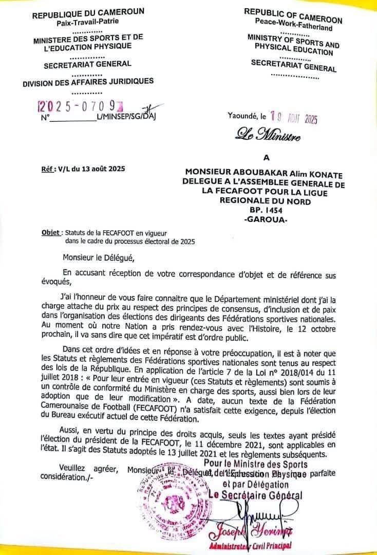Dans sa correspondance signée du 13 août 2025, adressée à Alim konate délégué à l'assemblée générale de la Fecafoot pour la ligue regionale du Nord, le Ministère des Sports et de l'éducation physique(MINSEP) clarifie le cadre légal pour les prochaines élections de la fédération camerounaise de football. Selon lui, seuls les statuts adoptés le 13 juillet 2021 et les règlements qui ont suivi sont en vigueur. Les textes antérieurs non vérifiés par le MINSEP ne s’appliquent pas.