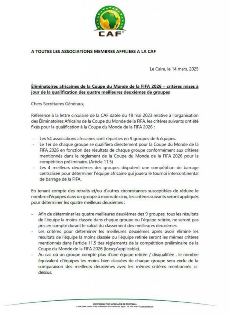 Le classement réajusté des meilleurs deuxièmes aux éliminatoires zone Afrique de la Coupe du Monde 2026 se présente comme suit: