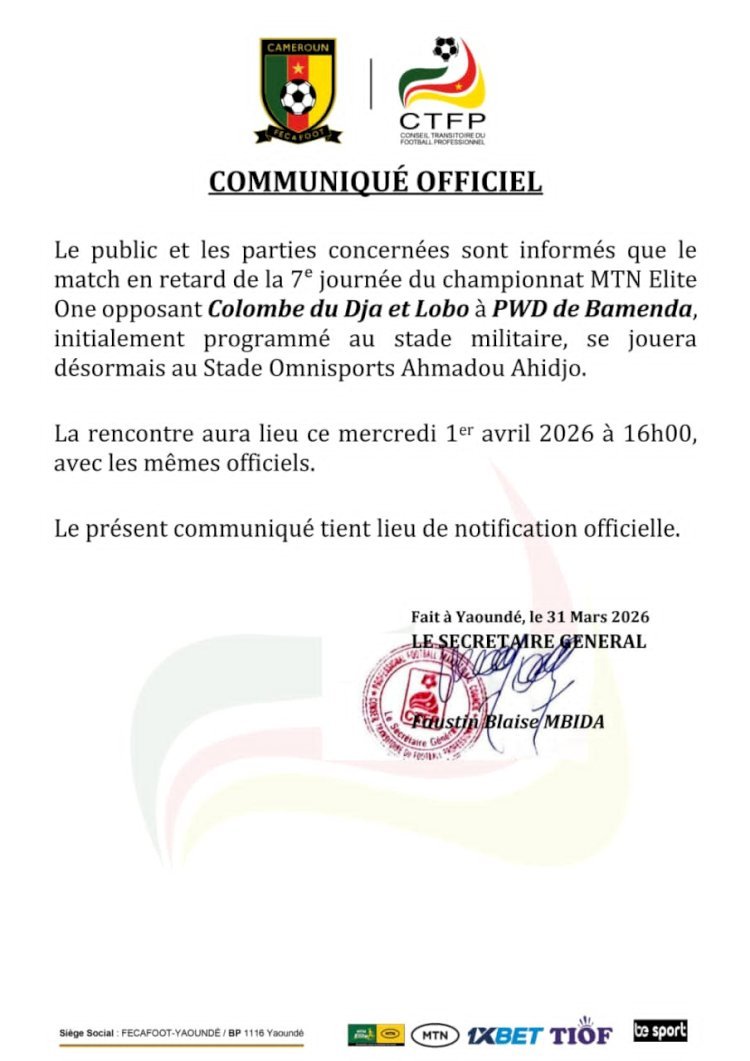 Le duel entre Colombe Sportive du Dja et Lobo et PWD de Bamenda, comptant pour la 7e journée en retard, change de site.