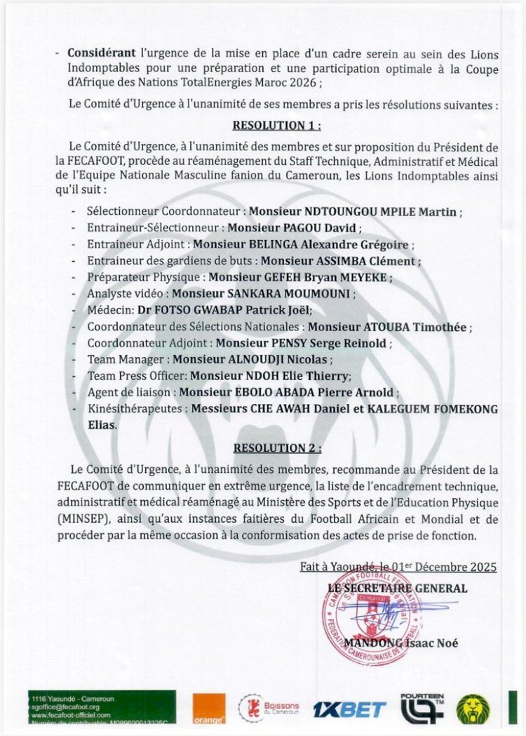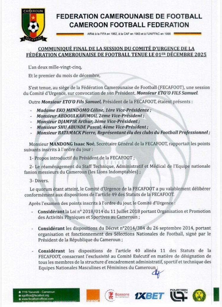 Réuni au lendemain de l'assemblée générale élective de la Fédération camerounaise de football, le comité d'urgence frappe fort d'entrée afin d'assainir la tanière et redorer le blason. Plusieurs résolutions prises à cet effet.