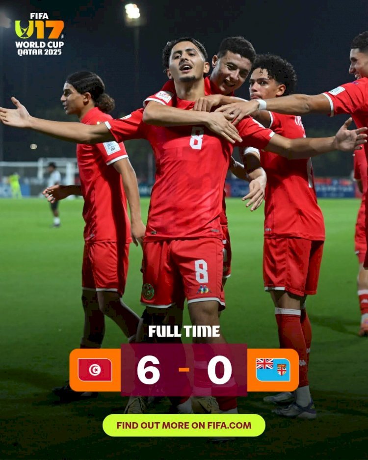 La sélection tunisienne U17 a parfaitement lancé sa campagne au Mondial qataris U17 2025, en s'imposant largement face au Fidji avec un score sans appel de 6-0. Cette victoire éclatante permet aux jeunes Aiglons du Carthage de prendre la tête du groupe D, à égalité de points avec l'Argentine, vainqueur de la Belgique dans l'autre match du groupe.