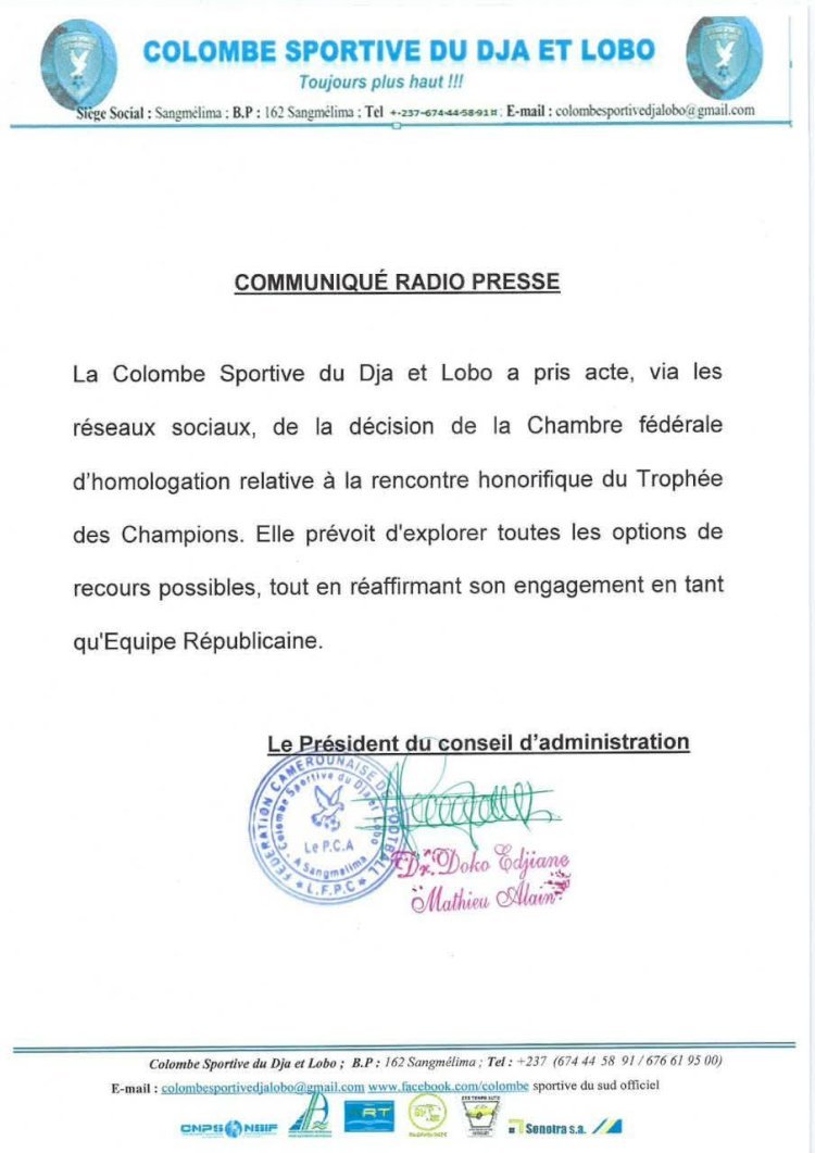 Dans un ton mesuré, la Colombe réaffirme par ailleurs son identité d’Équipe Républicaine", marquant son attachement au respect des institutions sportives. Une posture qui n’exclut pas, toutefois, une bataille juridique à venir dans ce dossier désormais sensible du football camerounais.